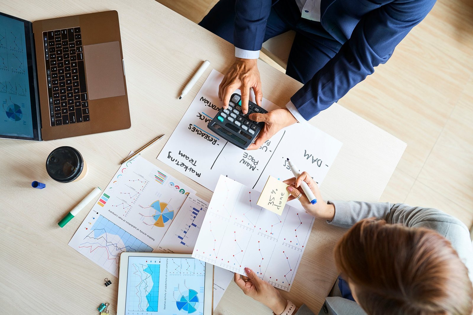 Businesswoman looking at graph with laptop on table in office